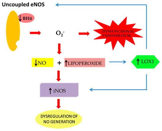 Nevertheless, in hypercholesterolemic patients, measurement of serum concentrations of circulating LOX-1 has been associated with the imbalanced regulation of L-arginine-NO pathway [16]. The consequent overproduction of reactive oxygen and nitrogen species (ROS and RNS, respectively) might be derived by the interaction between oxLDLs and LOX-1, leading to the activation of NADPH oxidase in vascular cells. The production of superoxide anions by NADPH oxidase, in turn, determines a reduced NO bioavailability, which leads to the dysregulation of the eNOS/iNOS balance and, finally, to endothelial dysfunction [17,18], thus promoting the atherosclerotic process [19]. A further effect of oxidative stress underlying endothelial dysfunction, is represented by the direct action of free radicals on eNOS. In fact, their overproduction causes eNOS uncoupling, which is unable to produce NO, but generates superoxide anions, thus amplifying the oxidative damage [20]. In this context, the reduced NO levels, as well as the increase of lipoperoxides, can upregulate iNOS activity to compensate for impaired NO bioavailability. Despite the activation of this adaptive mechanism, lipoperoxides exert a detrimental effect on endothelial cells in response to hypercholesterolemia. Indeed, their increase causes an enhanced expression of LOX-1 and, consequently, a further dysregulation of NO production [21].