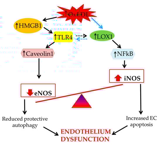 In summary, oxLDLs impair the balance between constitutive eNOS and inflammatory inducible iNOS in ECs. This occurs through enhanced expression of Caveolin-1, probably via HMGB1 and subsequent TLR4 signalling activation. Moreover, increased levels of TLR4 can induce the expression of LOX-1 because of the presence of a positive feedback between TLR-4 and LOX-1 [60]. In turn, LOX-1, which is also directly induced by oxLDLs, promotes the translocation of NF-kB into the nucleus. This inhibits protective mechanisms, such as eNOS function and protective autophagy, finally leading to EC apoptosis and subsequent endothelial dysfunction (Figure 3).