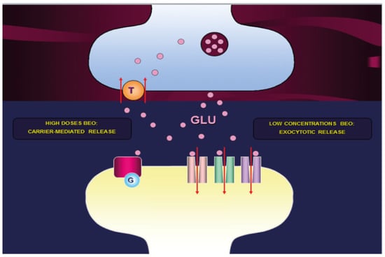 Mechanism of BEO-induced increase of synaptic glutamate. BEO in low concentrations causes glutamate exocytosis, while in high concentrations it induces the release of glutamate through a carrier-mediated Ca2+-independent process [58].