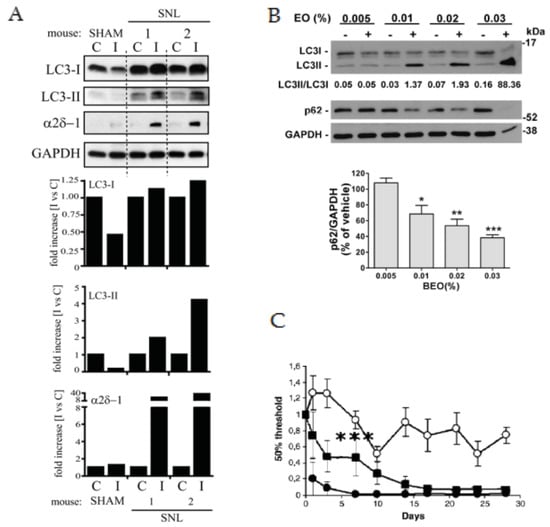 Autophagy and analgesic activity of BEO. (A) LC3 expression in the hemi-cord contralateral (C) and ipsilateral (I) to the side of ligation, 7 days after Spinal Nerve Ligation (SNL), showing higher LC3-I expression in ipsilateral side of SNL mice and appearance of LC3-II, thus demonstrating a derangement of autophagy in this neuropathic pain model. The slight increase in LC3-I levels and the apparent formation of LC3-II well correlated with α2δ-1 upregulation (Sham: n = 5, SNL: n = 6; adapted with permission from reference [81]). (B) BEO-mediated concentration-dependent induction of autophagy in SH-SY5Y cells, demonstrated by immunoblot showing the conversion of LC3I to LC3II and reduced p62 levels. Histogram shows the densitometric analysis of p62 levels normalized on the values of GAPDH (used as loading control) expressed as percentage of vehicle from three independent experiments (mean ± SEM). * p < 0.05, ** p <0.01, *** p < 0.001 vs. 0.005% BEO (ANOVA followed by Tukey-Kramer multiple comparisons test; adapted with permission from reference [84]). (C) A daily dose of BEO (square; 1 mL/kg) subcutaneously administered for 7 days attenuated SNL-induced mechanical allodynia compared to vehicle (filled circles; *** p < 0.001). Open circles indicate mechanical sensitivity of sham operated mice. Data are expressed as mean ± SEM of 50% of pain threshold and normalized to the basal value of each animal (n = 5–10 per group). Differences are evaluated using one way analysis of variance (ANOVA), followed by Tukey multiple comparisons test. Adapted with permission from reference [76].