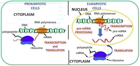 Protein synthesis is a crucial phase for any living organism; therefore, any phenomenon affecting any of the steps involved in such a crucial process could jeopardize life itself or cause severe disorders. Protein synthesis, in the classical vision of the central dogma, consists of two steps: transcription and translation (Figure 1) [1,2,3]. Therefore, any strategy aiming at correcting miscarried protein syntheses should intervene before the synthetic process is completed. In eukaryotic cells, as opposed to prokaryotic cells (Figure 1, left), transcription and translation are spatially and temporally separated, since transcription, which is followed by pre-mRNA processing, takes place in the nucleus, while translation occurs in the cytoplasm (Figure 1, right). The mature mRNA exits the nucleus, reaches the cytoplasm, where the ribosome ties itself to the mRNA’s start codon, and begins the translation process to produce a peptide chain. Protein synthesis goes on until the ribosome meets a stop triplet (UGA, UAA, or UAG), thus ending translation and releasing the synthesized polypeptide [4].