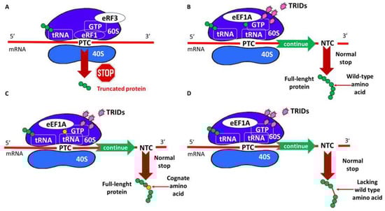 (A) Translation of premature termination codon (PTC)-containing mRNA in the absence of translational readthrough-inducing drugs (TRIDs); (B) ideal readthrough of PTC; (C) readthrough inserting a cognate amino acid; and (D) readthrough skipping amino acid insertion. Figure legend: mRNA, RNA messenger; tRNA, RNA transfer; 40S and 60S, small and large ribosome subunit, respectively; eEF1A, eukaryotic translation elongation factor 1A; eRF1 and eRF3, eukaryotic translation termination factor 1 and 3, respectively; and GTP, guanosine-5’-triphosphate.