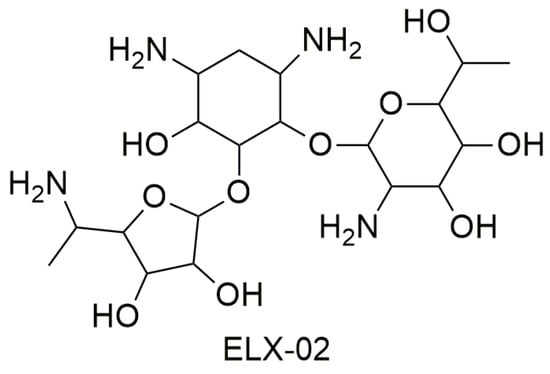 Most studies have demonstrated that tobramycin has low efficiency as a PTC suppressor, while gentamicin is very efficient as a TRID although it presents an undesirable toxic profile because of its ototoxicity and nephrotoxicity [38]. Some studies have demonstrated that the activity of aminoglycoside TRIDs varies depending on the stop codon sequence (UGA, UAA, or UAG) [32,39,40]. Moreover, the negative side effects of this class of drugs as TRIDs are also due to the readthrough of correctly positioned stop codons, thus demonstrating a lack of selectivity towards the premature stop codon. Additionally, aminoglycoside antibiotics cannot be used for long-term therapy (as it would be required by their use as TRIDs) because of the risk of inducing bacterial resistance [37]. An interesting alternative to gentamicin is represented by ELX-02 (Figure 4), a synthetic aminoglycoside that binds eukaryotic ribosomes and has been recently claimed to induce the readthrough of PTCs without the toxicity of the antibiotics.