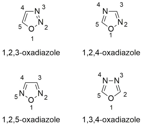 Oxadiazoles are aromatic heterocyclic rings containing one oxygen and two nitrogen atoms occupying different ring positions as in 1,2,3- [42], 1,2,4- [43,44], 1,2,5- [45], and 1,3,4-oxadiazoles [46,47] (Figure 5). Depending on the relative position of nitrogen and oxygen atoms, these classes of oxadiazoles possess different characteristics. For instance, 1,2,4-oxadiazoles have lower water solubility than 1,3,4-oxadiazoles because of the reduced hydrogen bond acceptor character of the nitrogen in 1,2,4-oxadiazole ring [43]. Moreover, they have been extensively studied because of their peculiar reactivity [43,48] and possible applications in material chemistry [49,50,51,52,53,54,55] or as bioactive compounds [44,56,57,58].