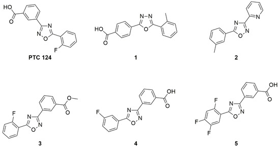 In 2007, a fluorinated 1,2,4-oxadiazole, specifically the 3-[5-(2-fluorophenyl)-1,2,4-oxadiazol-3-yl]-benzoic acid also known as Ataluren or PTC124 (Figure 6), was reported to promote the readthrough of nonsense mutations [33]. Ataluren is capable of promoting the readthrough of UGA, UAG, and UAA codons, but it shows the highest readthrough activity for the UGA codon [6,33]. Since Ataluren is structurally different from aminoglycosides, its discovery opened the way to a different class of drugs able to treat genetic disorders caused by nonsense mutations. Additionally, its activity profile within a 0.01–3 µM therapeutic range was better than that of gentamicin aminoglycoside, which was active as a TRID at much higher concentrations [6,33]. Furthermore, Ataluren is able to distinguish between normal and premature stop codons, thus inducing selective readthrough of PTCs without showing the typical toxicity of aminoglycosides. Indeed, several clinical trials have emphasized the safety and tolerability of Ataluren, even for long-term treatments [6,33,63].