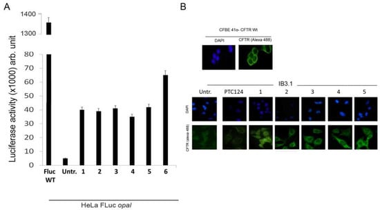 (A) Histogram of luciferase activity shown by HeLa cells after treatment with some of the most active compounds compared with untreated cells and with Fluc used as positive control; (B) Immunofluorescence of IB3.1 cells untreated (Untr; negative control) or treated with PTC124 (Ataluren; positive control) and compounds 1–5 respectively. Cystic fibrosis transmembrane regulator (CFTR) protein was revealed by a specific antibody targeting its first external loop (secondary antibody in green, Alexa-488). Nuclei (blue) were DAPI (4′,6-diamidino-2-phenylindole) stained.