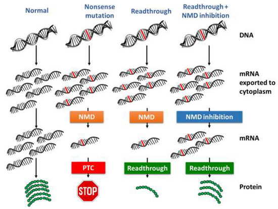 Nonsense suppression drugs, hence, reduce the efficiency of translation termination at in-frame premature termination codons, thereby allowing ribosomes to resume translation elongation and generate a full-length protein. However, as already highlighted, the efficiency of readthrough can be limited by nonsense-mediated mRNA decay (NMD) [82].