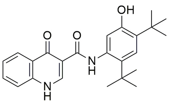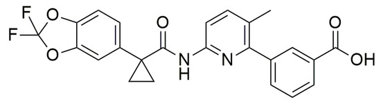 Alternatively, “CFTR potentiators” are small molecules that increase the possibility of CFTR’s opening in the presence of an agonist. These drugs can be used in the case of patients that have gating problems. Ivacaftor (Figure 12) was approved by FDA in patients, aged six and above, that have CFTR gating mutations; it acts by increasing chloride levels in the presence of ΔF508 [25].