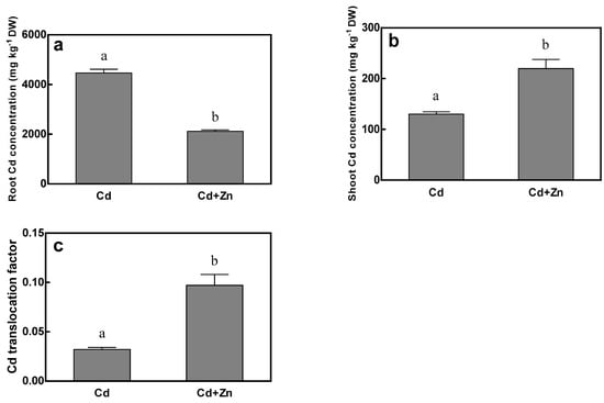 4.3.2. Determination of Cd and Zn Concentration in Shoots and Roots