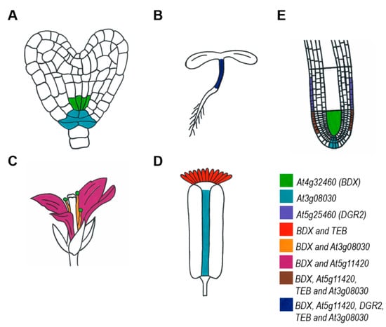 In Arabidopsis, DGR1, BDX, At5g11420, DGR2, TEB, and At3g08030 expression was detected in the primary root. BDX, At5g11420, DGR2, TEB, and At3g08030 were expressed in epidermal cells of the meristematic region. BDX also was expressed in vascular tissue and At3g08030 was expressed in the quiescent center and in columella [,,] (Figure S1). These expression patterns were similar to those found during embryonic development.