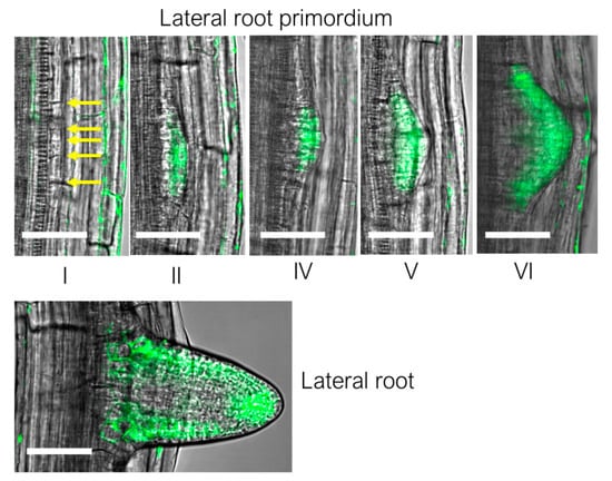 Expression patterns of At3g08030 during lateral root development. The Arabidopsis pAt3g08030::ER-GFP-transgenic plants were obtained as described in Salazar-Iribe et al. []. Roman numerals indicate the developmental stages of the lateral root initiation process. The images are all section images. n = 8–10 roots for each developmental stage. Scale bars = 20 µm.