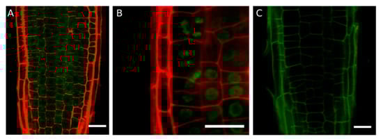 Subcellular localization of the TEB protein in meristematic root cells synchronized with hydroxyurea. (A) Arabidopsis pTEB::TEB-GFP seedlings were treated with hydroxyurea for 16 h, and a diffuse pattern of GFP in meristematic cells of the cortex was observed. The cell wall was stained with propidium iodide (red). (B) After 18 h of hydroxyurea treatment, GFP was detected as a ring surrounding the nucleus in the cortex cells. (C) TEB was located in the cell wall after 19 h of hydroxyurea treatment. Hydroxyurea stops DNA synthesis and after 16–17 h most of the cells are at the G2/M transition and at 18–20 h cytokinesis occurs according to Cools et al. []. Seedlings were sown in MS medium and transferred on day 6 to MS medium with hydroxyurea for 16–20 h. The images are all section images. Scale bars = 20 µm. The Arabidopsis transgenic plants were obtained as described in Salazar-Iribe et al. [].