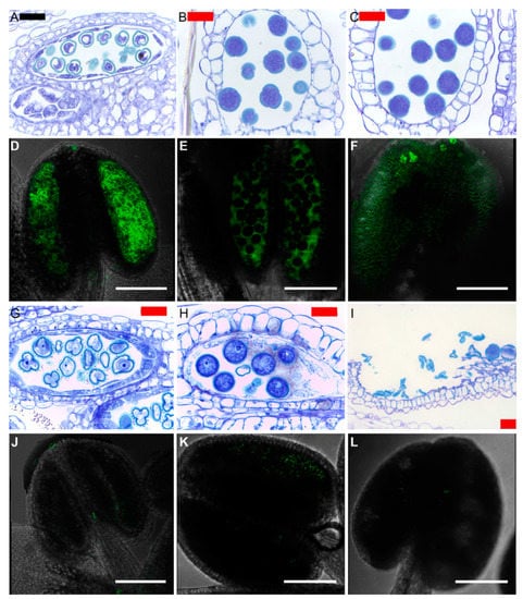 Pollen grain development and auxin accumulation in anthers of flowers from wild-type and bdx-1 mutant Arabidopsis plants. Normal pollen grain development in wild-type (wt) flowers. (A) Anthers from 7–8 stage flower. (B) Anthers from 11–12 stage flower. (C) Anthers from 13 stage flower. GFP detection of auxins in anthers from wt/DR5 flowers. (D) Anthers from 7–8 stage flower. (E) Anthers from 11–12 stage flower. (F) Anthers from 13 stage flower. Throughout the development of the anther there is an important accumulation of auxins. Pollen grain development in bdx-1/DR5 flowers. (G) Anthers from 7–8 stage flower. (H) Anthers from 11–12 stage flower. (I) Anthers from 13 stage flower. The development of pollen grains is altered; at the 11–12 stage, diffuse cytoplasm is observed and, at stage 13, some pollen grains have collapsed. GFP detection of auxins in anthers from bdx-1/DR5 flowers. (J) Anthers from 7–8 stage flower. (K) Anthers from 11–12 stage flower. (L) Fertilized flowers at stage 13. Throughout the development of the anther there is almost no accumulation of auxins. The Arabidopsis transgenic plants were obtained as described in Cruz-Valderrama et al. []. Sections: 1–2 μm. Staining was with toluidine blue. Red bar = 20 μm, Black bar = 10 μm. n = 8–10 plants for each line. White bar = 100 μm. n = 5–9 anthers from flowers from different plants.