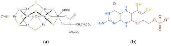 Molybdenum cofactors. (a) The iron-molybdenum cofactor (FeMoCo) of bacterial nitrogenases and (b) pyranopterin molecule from which the pterin-based cofactors (MoCo) are originated. Molecules drawn with BioVIA Draw 2019 [8].