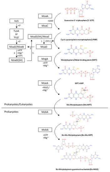 Biosynthesis of molybdenum cofactor in all families initiates with the formation of the cyclic pyranopterin monophosphate (cPMP) from guanosine-5′-triphosphate (5′-GTP) in a process involving two enzymes: MoaA and MoaC (Figure 2) [3,17].