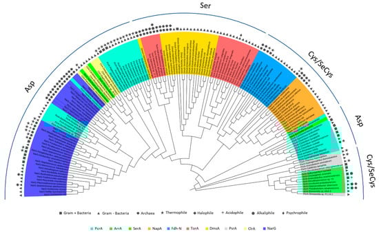 Periplasmic nitrate reductases and formate dehydrogenases N [86,88] form a monophyletic group. This relationship has already been reported and it is not only due to being part of the same type but also because of the presence of a highly conserved lysine residue. It has a role in the electron flow in redox reactions in both enzymes [89,90]. In NapA and Fdh-N clade, an early divergence between extremophilic archaeal and mesophilic bacterial NapA and Fdh-N is observed but no comparative research about it has been reported yet.