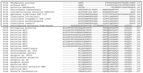 The genomic context of the selected enzymes in this work has not be analyzed; consequently, the content of the genomic island is unknown. Nevertheless, sequence alignments of the PcrA of three groups have shown that in the region of conserved Asp residue for Mo coordination, the alignment differs in each group. The sequences of polypeptides annotated has PcrA but phylogenetically closest to type I DMSO reductases are very different to the other two groups, and indeed the Asp residue is not clearly identified in the alignments (Figure 7). So, more research will be necessary to clarify the classification of this group of enzymes.