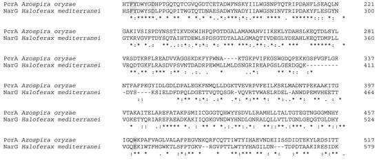 The sequences of thermophilic PcrA also differ from the other two groups, some of them have longer chains (up to 1166 amino acids residues) and the aspartate ligated to Mo is clearly identified in the alignments. This group of PcrA shows an ancestral origin with respect the other type III DMSO reductases. Given that perchlorate probably existed on Earth in early geological times, it is possible to conclude that the capacity of thermophilic bacteria to respire perchlorate may have developed very early. The third cluster of PcrA corresponds to the Rhodocyclales betaproteobacteria. These chains form a monophyletic clusterwith NarG, as has been previously described [95]. NarG from haloarchaea are closer to this group of PcrA than to bacterial NarG. The reason for this could be because PcrA and haloarchaeal NarG are periplasmic subunits and therefore both contains a TAT signal that is absent in the NarG from bacteria (facing the cytoplasmatic side). Sequence homology is greater between haloarchaea NarG and bacterial PcrA than with bacterial NarG, and their structures will also probably be. This close relationship had been previously described with concatenated PcrAB sequences that were aligned to three of Archaeal periplasmic nitrate reductases [99].