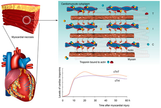 Cardiac troponin is a regulatory protein of striated muscle contraction that is present as a complex in the thin filaments of myofibrils and has three subunits: cardiac troponin T (cTn T), cardiac troponin I (cTn I), and cardiac troponin C (cTn C) [9]. cTn I and cTn T are cardiac-specific and highly sensitive biomarkers that reflect myocardial damage [10,11]. They can be detected in the blood 3–4 h after myocardial infarction, peak after 16–18 h, and last for up to two weeks in the blood [9,12,13,14] (Figure 1). Due to the high sensitivity and specificity of myocardial injury, cardiac troponins are recommended by the European Society of Cardiology and the American College of Cardiology to be the primary choice and significant reference for the diagnosis of myocardial infarction [15,16,17]. The levels of cardiac troponins not only have the effect of diagnosing myocardial infarction but also can be used to assess the severity of infarction and prognosis in clinical medicine [18,19,20,21].