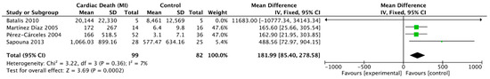 The meta-analysis was performed based on the above description. Heterogeneity was significant when p < 0.05 and/or I2 > 50%, and a random-effect model was used; if not, a fixed-effect model was used. In the six groups mentioned above, the fixed-effect model was applicable for studies on the postmortem cTn I concentrations in the pericardial fluid between the cardiac death (myocardial infarction) and control groups, and the random-effect model was used to analyze data in the other groups. Compared with the control group, the level of cTn I in the pericardial fluid was higher than in the cardiac death group (weighted mean difference (WMD) = 181.99, 95% confidence interval (CI) = 85.40–278.58, p = 0.0002; I2 = 7%, p = 0.36) (Figure 2). However, no significant difference was found for the postmortem cTn T in the pericardial fluid between the cardiac death and control groups (WMD = 38.55, 95% CI = −22.18 to 99.29, p = 0.21; I2 = 83%, p = 0.02) (Figure 3).
