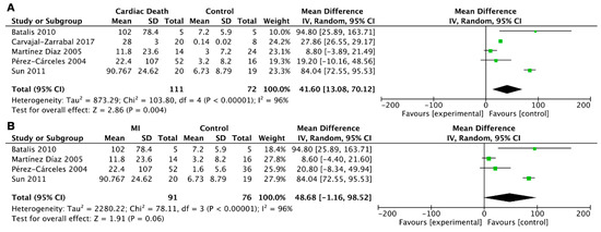 Forest plot of cTn I in serum: (A) comparison of serum cTn I between cardiac death and control groups; (B) comparison of serum cTn I between the myocardial infarction (MI) and control groups.