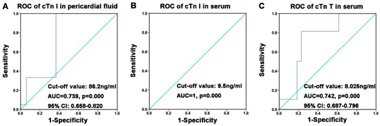 Receiver operating characteristic (ROC) curve of cardiac troponins in pericardial fluid and serum: (A) ROC of cTn I in pericardial fluid; (B) ROC of cTn I in serum; (C) ROC of cTn T in serum.
