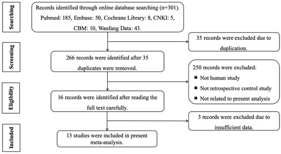 A total of 301 studies were collected using the search strategy, of which there were 185 works found in PubMed, 50 in Embase, 8 in the Cochrane Library, 5 in the China National Knowledge Infrastructure (CNKI), 10 in the China Biomedical Literature Database (CBM), and 43 in Wanfang Data. Of the 301 articles, 35 records were excluded due to duplication, and finally, 13 studies were included in the present meta-analysis after screening the full text carefully according to the inclusion and exclusion criteria.