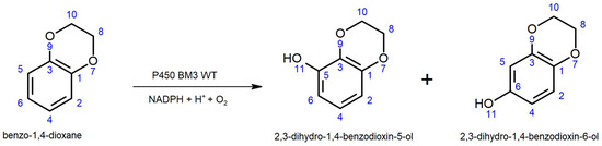 The hydroxylation of benzo-1,4-dioxane by cytochrome P450 monooxygenase (P450) Bacillus megaterium 3 (BM3) wild type (WT) leads to the formation of 2,3-dihydrobenzo-1,4-dioxin-5-ol and 2,3-dihydrobenzo-1,4-dioxin-6-ol at a 70/30 ratio.