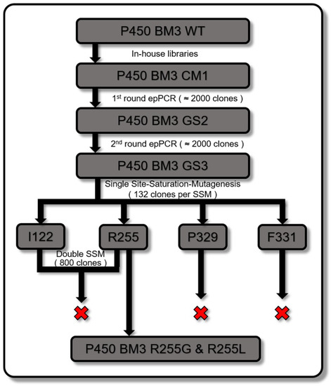Summary of P450 BM3 engineering strategy. Starting from the top to the bottom, in-house libraries of P450 BM3 were screened yielding P450 BM3 CM1 (R255P/P329H), which was subjected to epPCR, and P450 BM3 GS2 (R255S/P329H/F331L) was generated. P450 BM3 GS2 was subjected to another epPCR round yielding P450 BM3 GS3 (I122V/R255S/P329H/F331L). P450 BM3 WT was subjected to single site saturation mutagenesis (SSM) in the four identified positions and double SSM at positions I122 and R255, which led to the most active variants, P450 BM3 R255G and R255L.