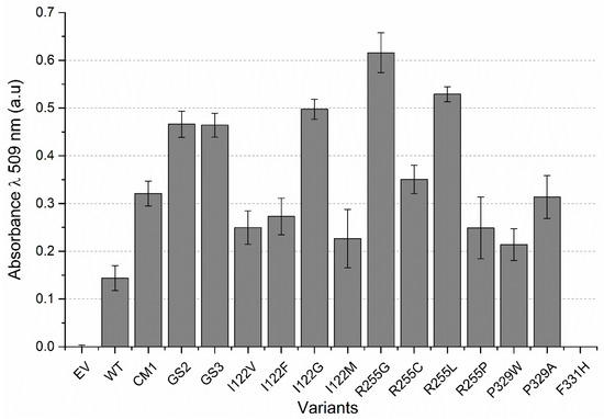 Comparison of 2,3-dihydrobenzo-1,4-dioxin-5-ol and 2,3-dihydrobenzo-1,4-dioxin-6-ol formation by the colorimetric 4-aminoantipyrine (4-AAP) assay (λ 509 nm). Results show the best-performing P450 BM3 from SSM at the positions 122, 255, 329, and 331. Error bars represent one SD of the mean from seven replicates. CM1 (R255P/P329H), GS2 (R255S/P329H/F331L), and GS3 (I122V/R255S/P329H/F331L). EV—negative lysate control.