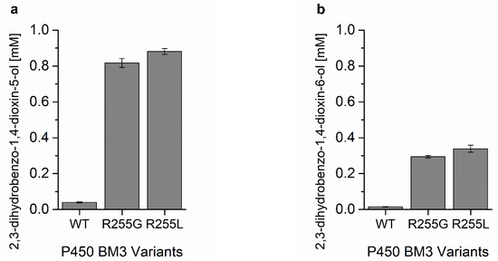 The obtained P450 BM3 R255G (R255G) and P450 BM3 R255L (R255L) variants were expressed, purified, quantified (Figure A9 and Figure A10), and characterized in detail by performing conversions of benzo-1,4-dioxane in 1 mL volume in the presence of a cofactor regeneration system (GDH). Product formation was assessed with GC-FID. We observed solubility issues for benzo-1,4-dioxane as its limit was 1.2 mM when using ethanol as a co-solvent. After 1 h of conversion, under constant NADPH regeneration, R255G and R255L produced 0.80 ± 0.02 mM and 0.86 ± 0.02 mM of 2,3-dihydrobenzo-1,4-dioxin-5-ol, respectively, whereas P450 BM3 WT (WT) produced 0.040 ± 0.003 mM (Figure 6a). This is a ≈20- and ≈22-fold improvement over WT for R255G and R255L.