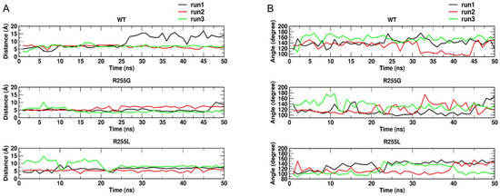 (A) Calculated distance between C5-atom of substrate and iron-bound oxygen species. (B) Calculated angle between benzo-1,4-dioxane substrate and heme required for the hydroxylation of benzo-1,4-dioxane in WT and variants R255G and R255L along three independent 50 ns molecular dynamics (MD) simulation trajectories.