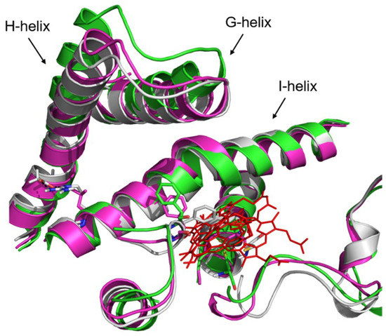 Cartoon representation of the structural alignment of P450 BM3 WT (grey) and P450 BM3 variants (R255G in green and R255L in magenta). Heme is depicted in red lines and residue F87 in sticks. A substantial rearrangement of the G-, H-, and I-helixes is observed. The models of the P450 BM3 variants R255G and R255L were constructed using the swap function in YASARA Structure Version 17.4.17 and optimized using the SCWRL rotamer library search for the designated substitutions.