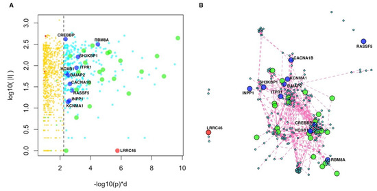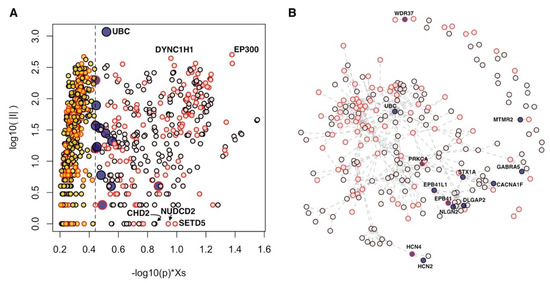 Genes in network proximity to the core genes of autism spectrum disorders (ASDs). (A) Diffusion score (Xs) normalized by its empirical p-value (horizontal axis) and number of interactions (|I|, vertical axis); only genes with p < 0.05 are shown. (B) Connected components of “core+13” network. (A,B) Blue points: 13 genes of “core+13”; pink points: core genes; yellow points: Significant genes outside “core+13” genes; red border of points: Genes supported at transcriptomic and/or epigenetic levels.