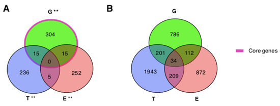 Overlaps among genes associated with ASDs by genomics, epigenomics, and transcriptomics. (A,B) G: Genomics; E: Epigenomics; T: Transcriptomics. ** major.
