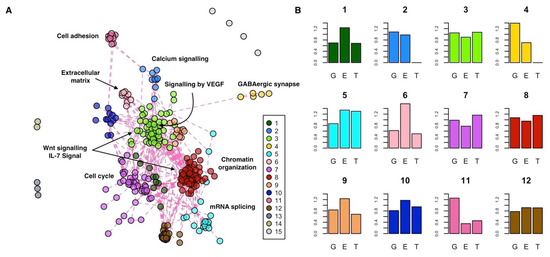 Functional characterization of the INT-MODULE. (A) Topological clusters; #1–12: Clusters of the largest connected component; #13,14: Two clusters of three and two genes, respectively; #15: The remaining four genes. (B) Enrichment (vertical axis) of each cluster in terms of genes supported by genomics (G), epigenomics (E), and transcriptomics (T): A value of 1 indicates the same proportion within the cluster and in the whole INT-MODULE.