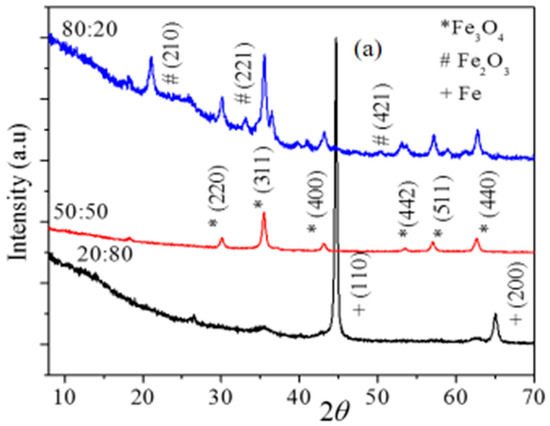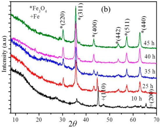 The nanocomposites obtained by the milling of the three different compositions of GO-Fe (20:80, 50:50 and 80:20) were washed with water by centrifugation at 5000 rpm and dried in an oven at 50 °C. XRD profiles obtained from the three different compositions of GO-Fe nanocomposites, which were milled for 45 h, are shown in Figure 1a. The XRD profiles in Figure 1a reveal diffraction peaks corresponding to Fe, Fe3O4 and Fe2O3, depending on the composition of GO and Fe used for milling. The magnetic phases obtained upon ball milling of metallic Fe powder and GO at similar conditions have resulted in different phases of iron oxide. The XRD pattern of GO-Fe with a 20:80 composition showed peaks corresponding to Fe and Fe3O4 phases. The peaks corresponding to Fe3O4 phase had less intensity compared to the Fe phase, which indicates that the presence of a lesser amount of graphene oxide results in suppressed oxidation of Fe, whereas in the case of a 50:50 composition, the Fe powder was completely oxidized into Fe3O4 phase [26,27]. In the case of the 80:20 composition, the nanocomposite had XRD peaks corresponding to both Fe3O4 and Fe2O3, which can be attributed to the role of graphene oxide. The formation of different magnetic phases was clearly related to the amount of graphene oxide used. The oxidation of the Fe powder can be attributed to the adsorbed oxygen and water trapped between the layers of graphene oxide. The oxidation extent of Fe is completely determined by the amount of graphene oxide. The 50:50 composition resulted in a pure Fe3O4 phase and thus it was used for the hyperthermia experiments in this work. The XRD patterns of these samples with several milling durations are shown in Figure 1b. From the XRD patterns it was evident that the Fe3O4 phase started forming at a milling time of 10 h, and appeared in all other samples at 25, 35 40 and 45 h of milling time. The average crystalline sizes for all the samples were calculated using FWHM (Full Width Half Maximum) of the highest intensity peak (311). The average crystalline sizes of the Fe3O4 nanoparticles was around 20 nm. At a 25 h milling time, a higher percentage of Fe3O4 phase than the Fe phase could be inferred by the intensity ration of highest intensity peaks (311) and (110) which correspond to Fe3O4 and Fe, respectively [28]. Upon continuation of milling, the intensity of XRD peaks corresponding to Fe decreased and eventually all the Fe was oxidized to Fe3O4 after 40 h of milling.