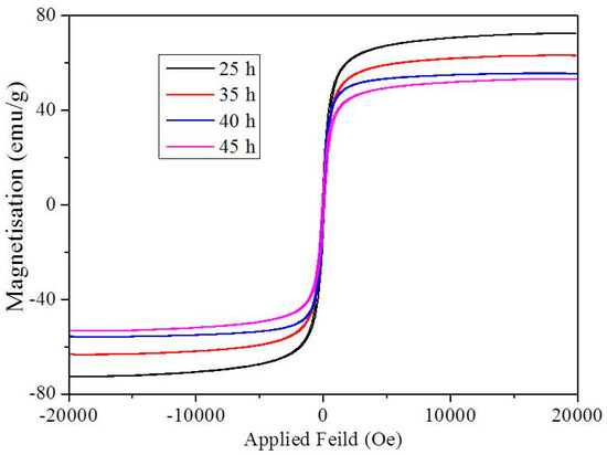 The magnetization (M) as a function of applied field (H) (M-H loops) was measured for the GO-Fe (50:50) with milling times of 25, 35,40 and 45 h at room temperatures, and are shown in Figure 4. M-H curves show that all the samples were superparamagnetic in nature. The saturation magnetization for the 25 h milled sample was the highest with a value of 78 emu/g. Saturation magnetization of the nanocomposites decreased with an increase in milling time from 25–40 h, which can be attributed to the decrease in Fe in the resulting composition. The decrease in the magnetization from milling times of 40 and 45 h was due to the size effect which can be attributed to the magnetically disordered surface spins, higher milling times makes the magnetic nanoparticles finer.