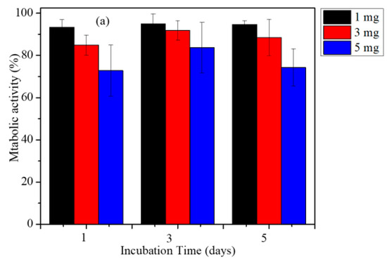 The GO-Fe (50:50) nanocomposites synthesized from the ball mill method were examined for their magneto thermal ability to raise the temperature of water. The increase in the temperature of water after applying an alternating magnetic field (AMF) with magnitude 3.6 kA/m and frequency 236 kHz was recorded using an alcohol thermometer. The magneto thermic data of the samples milled to different times (25–45 h) was obtained for 1, 3 and 5 mg/mL concentrations (Figure 5). SAR values were calculated for all the samples using equation (1). The SAR vs. milling time plot is shown in Figure 5d. The trend in the variation of SAR values with respect to milling time showed a composition dependent SAR. The 25 h milled composite showed the highest SAR value for all concentrations it decreases with further milling. This shows that the magnetic heating caused by the nanocomposite depends on the milling time. Since the 40 h milled sample had a pure Fe3O4 magnetic phase and better SAR value compared to the 45 h milled sample, the in vitro studies for the killing of cancer cells were performed using this sample.