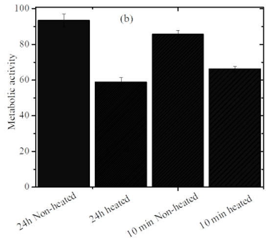 The biocompatibility of the magnetic nanocomposite was determined by quantifying the metabolic activity of the cells using MTT assay. The magnetic nanocomposites were sterilized by exposing them to UV light for 10 min. Tissue culture plate was seeded with 3 × 104 cells per well and incubated for 24 h. After 24 h incubation, 1 mg/mL composite solution was added to the wells and the cells were subjected to Alternating Magnetic Field (AMF) using Ambrell Easy heat induction heater for 10 min. Immediately after treatment, MTT solution (0.5 mL) was added to each well and incubated for 2 h. The insoluble formazan crystals formed were dissolved in dimethyl sulphoxide (DMSO) and the optical density was recorded at 570 nm using a plate reader (Tecan Infinite M 1000 Pro., Durham, NC, USA).
