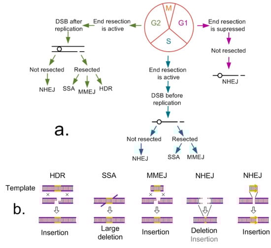 Main mechanisms of double-strand break (DSB) repair in eukaryotes: (a) Dependence of the choice of repair pathway on the phase of the cell cycle and (b) the results of repair by different mechanisms in the presence and absence of a donor template.