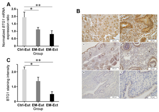 BTG1 mRNA expression in eutopic and ectopic endometrial tissue samples obtained from patients with or without endometriosis. (A) Differences in BTG1 mRNA expression levels among 3 groups: eutopic endometrium of the control group (Ctrl-Eut) and the endometriosis group (EM-Eut) and ectopic endometrium (EM-Ect). The expression levels of BTG1 mRNA are normalized to that of GAPDH mRNA. (B) BTG1 protein expression in eutopic and ectopic endometrial tissue samples. (a) Eutopic endometrial tissue shows uniform and strong BTG1 immunoreactivity in the glandular and stromal cells (×100). (b) High-power view of image a. The cells in the endometrial glands and stroma exhibit strong BTG1 expression both in the nucleus and cytoplasm (×400). (c) Eutopic endometrial tissue of a patient with endometriosis displays patchy BTG1 expression with variable staining intensity (×100). (d) High-power view of image c. About half of the endometrial glandular epithelium and stromal cells show weak-to-moderate nuclear and cytoplasmic BTG1 immunoreactivity (×400). (e) Ectopic endometrial tissue in a patient with endometriosis (×100). (f) High-power view of image e. BTG1 expression is absent in the ectopic endometrial tissue. A faint nonspecific cytoplasmic staining is observed in the glandular epithelium (×400). (C) Differences in BTG1 staining intensity among 3 groups. * p < 0.05, ** p < 0.01. Error bars represent standard error of mean.