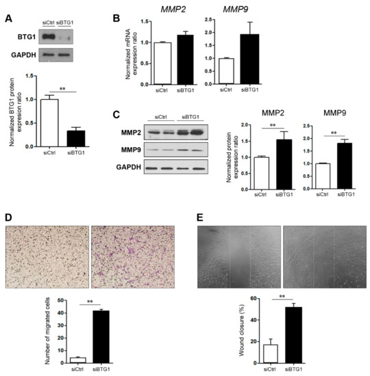 We observed that the expression levels of BTG1 was reduced in endometriosis. Therefore, we speculated that downregulation of BTG1 may have effects on the migration of HESCs. We confirmed a reduction in BTG1 expression after BTG1 siRNA transfection of HESCs (Figure 2A), and then examined the mRNA expression levels of MMP2 and MMP9, which encode matrix metalloproteinase 2 (MMP2) and MMP9, respectively. They are well-known indicators for cell migration [20,21,22,23], and previous studies have shown that expression of MMP2 and/or MMP9 were elevated in endometriosis [24,25,26]. RT-PCR revealed that BTG1 siRNA-transfected cells exhibited 1.18- and 1,94-fold increases in MMP2 and MMP9 mRNA expression levels compared to vehicle-treated control cells, with marginal significance (p = 0.059 and p = 0.089, respectively; Figure 2B). In line with this finding, the expression levels of MMP2 and MMP9 proteins were significantly increased in the transfected cells compared with the control cells (Figure 2C), indicating that BTG1 downregulation in HESCs induces an increase in their migration potential.
