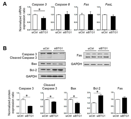 To measure BTG1 mRNA levels, total RNAs were isolated from cultured cells using the RNeasy Mini Kit (Qiagen Inc., Valencia, CA, USA). RNA sample concentrations were analyzed using a Nanodrop 2000 spectrophotometer (Thermo Fisher Scientific, Waltham, MA, USA). The Superscript III kit (Invitrogen) was used to synthesize cDNA using 1 µg of total RNA primed with oligo(dT). PCR was performed in a C1000 Thermal Cycler (Bio-Rad Laboratories, Hercules, CA, USA). The synthesized cDNA products were stored at −20 °C. qPCR was performed with 2 µL of synthesized cDNA as template using a 7300 Real-Time PCR System (Applied Biosystems, Foster City, CA, USA). Real-time PCR was performed using the Power SYBR Green PCR master mix (Applied Biosystems). The reaction mixture included the cDNA template, forward and reverse primers, ribonuclease-free water, and the SYBR Green PCR master mix at a final reaction volume of 20 µL. Reactions were performed at 95 °C for 5 min, followed by 40 cycles of 95 °C for 30 s, 60 °C for 30 s, 72 °C for 1 min, and a final extension at 72 °C for 5 min. Threshold cycle (Ct) values and melting curves were calculated using the 7300 Real-time PCR system software (Applied Biosystems). Each reaction was performed in triplicates. If not specified, the mRNA levels in each sample were normalized to those of GAPDH. Primer sequences for BTG1, Caspase 3, Caspase 8, Fas, FasL, MMP2, MMP9 and GAPDH are shown in Table 3. The product amount was calibrated to the internal control reference using the ΔΔCt analysis [36].