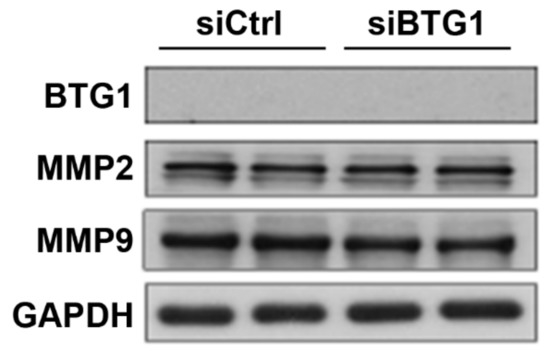 We prepared protein extracts using a radio-immunoprecipitation assay buffer containing protease and a phosphatase inhibitor cocktail (Thermo Fisher Scientific). We determined the concentrations of total cell lysates using Pierce BCA protein assay kit (Thermo Fisher Scientific). We mixed 20 μg of total protein with 5× sample buffer, and then heated at 95 °C for 5 min. Samples were loaded on 12% sodium dodecyl sulfate-polyacrylamide gels and transferred to a polyvinylidene fluoride membrane (EMD Millipore, Burlington, MA, USA) with use of a Transblot apparatus (Bio-Rad Laboratories). Membranes (EMD Millipore) were blocked with 5% non-fat skim milk in Tris-buffered saline solution (10 mmol/L Tris-hydrogen chloride (pH 7.4) and 0.5 mol/L sodium chloride) with 0.1% v/v of Tween-20 (TBS-T). The blots were probed with primary antibodies against BTG1 (1:200, Abcam), MMP9 (1:250, Santa Cruz) with TBS-T; MMP2 (1:250, Santa Cruz) with TBS-T, Caspase 3 (1:1,000, Cell Signaling Technology, Danvers, MA, USA) with TBS plus 5% skim milk, Bax (1:500, Santa Cruz) with TBS plus 5% skim milk, Bcl-2 (1:1000, Cell Signaling Technology) with TBS plus 5% skim milk, and GAPDH (1:1000, Santa Cruz) with TBS plus 5% skim milk. They were then incubated in horseradish peroxidase-conjugated secondary antibodies (1:2000, Thermo Fisher Scientific). Proteins were detected using enhanced chemiluminescence (Santa Cruz). The experiment was repeated three times and the data shown are representative.