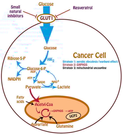 We also consider and define the differences in the energy metabolism of normal and cancer cells, as a biochemical basis for the identification of possible targets for metabolic therapy in the treatment of cancer. A promising strategy for antitumor therapy could be the inhibition of glucose transporters in neoplastic cells, thus generating a state of energy deprivation that may facilitate the effect of other anticancer therapies [,]. It is interesting to investigate the possibility of using natural drugs such as RSV in combinatorial treatment in order to reduce the side effects and improve cancer treatments.