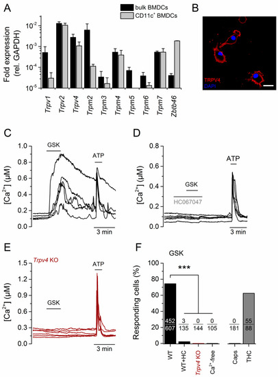 TRPV4 was functionally expressed in CD11c+ bone marrow-derived cells (BMDCs). (A) Expression profile of selected Trp genes in the total granulocyte-macrophage colony-stimulating (GM-CSF)-differentiated bone marrow-derived cell population (black bars) and in CD11c+-purified BMDCs (light gray). Values are relative to GAPDH expression. (B) Confocal image of CD11c+ BMDCs stained with an anti-TRPV4 antibody (red). The blue color corresponds to nuclear staining with DAPI. (C–E) Representative traces of intracellular Ca2+ concentration in CD11c+ BMDCs showing the effects of 300 nM of GSK1016790A (GSK). ATP (100 μM) was used as a positive control for intracellular Ca2+ increase. The TRPV4 antagonist HC067047 was used at 10 μM. (F) Percentage of CD11c+ BMDCs responding to the indicated stimulus. GSK, GSK1016790A (300 nM); HC, HC067047 (1 µM); Ca2+-free, Krebs with nominal [Ca2+] supplemented with 2.5 mM EDTA; Caps, Capsaicin (1 nM); THC, trans-Δ9-tetrahydrocannabinol (10 µM). The responding fraction is indicated within each bar. ***, p < 0.001, Fisher’s exact test.
