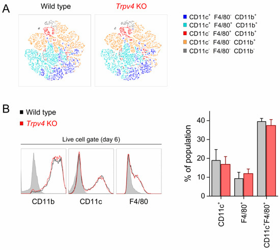 TRPV4 was dispensable in the differentiation of CD11c+ BMDCs. (A) Color-coded two-dimensional t-distributed stochastic neighbor embedding (tSNE) representations of the total bone marrow-derived cell population (20,000 cells) defined by the surface markers CD11b, CD11c, and F4/80. (B) Histograms showing surface expression of the indicated markers in bone marrow-derived cells from wild-type (WT, black traces) and Trpv4 knockout (KO, red traces) mice. The shaded histograms represent specificity (fluorescence minus one) controls. The bar graph shows the percentage of different cell populations present in total bone marrow-derived cell cultures defined by the surface expression of CD11b, CD11c, and F4/80. The data are represented as mean ± SEM of nine independent experiments.