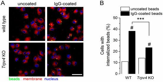 Next, we used IgG-coated beads to evaluate the role of TRPV4 in FcR-dependent endocytosis. For both WT and Trpv4 KO BMDCs, the uptake of IgG-coated beads was significantly increased compared to uncoated beads (Figure 5B). However, BMDCs deficient in TRPV4 exhibited a significantly lower proportion of bead-containing cells (38.2% vs. 23.4%, p < 0.05, two-tailed Fisher’s test). Altogether, these results demonstrate that TRPV4 was dispensable in the FcR-independent process, but contributed to FcR-mediated phagocytosis.