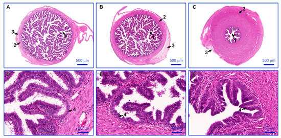 Representative sections of porcine oviducts stained with hematoxylin and eosin. (A) the infundibulum, (B) the ampulla, (C) the isthmus, (D–F) epithelium lining the mucosal folds, in the infundibulum, the ampulla and the isthmus, respectively. Arrows: 1: mucosal folds, 2: muscle layer, 3: serosa, and 4: simple columnar ciliated epithelium.